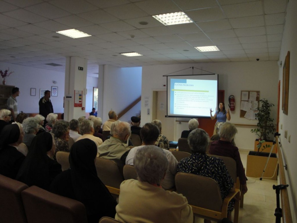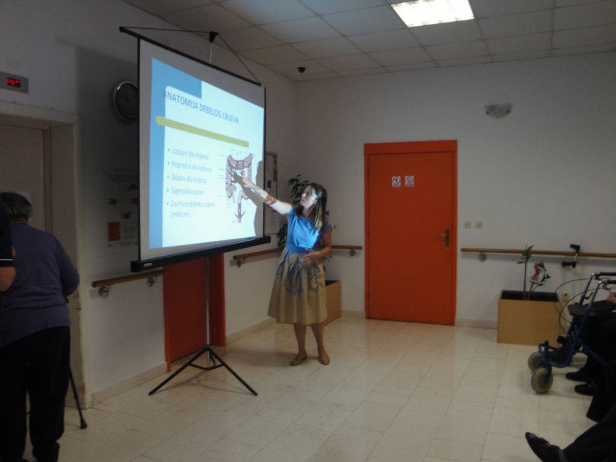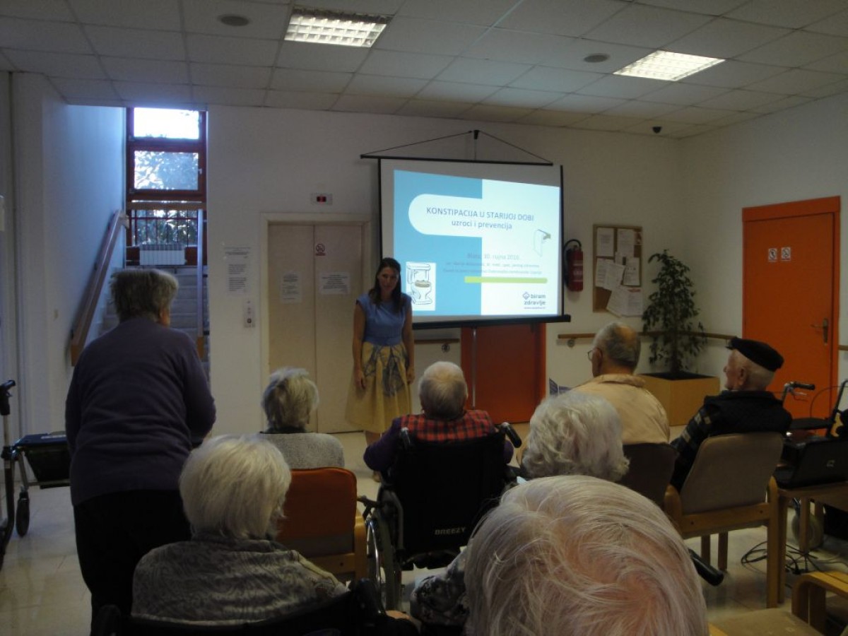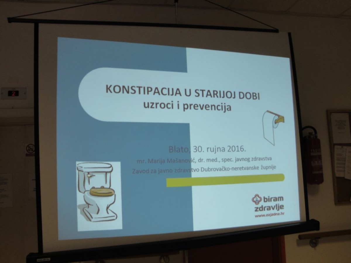 Povodom Međunarodnog dana starijih osoba Zavod za javno zdravstvo Dubrovačko-neretvanske županije organizirao je predavanje "Konstipacija u starijoj dobi – uzroci i prevencija" u petak, 30. rujna 2016. u prostorima Doma za starije i nemoćne osobe "Majka Marija Petković" u Blatu. Predavanje je održala liječnica Marija Mašanović. Konstipacija je jedan od najčešćih problema modernog doba od kojeg boluje 2-3% populacije. Povezana je sa sjedelačkim načinom života, nepravilnom i neredovitom prehranom, nedovoljnim unosom tekućine i tjelesnom neaktivnošću. U starijoj dobi problem konstipacije je učestaliji jer se fiziologija probave mijenja (povećava se rektalni kapacitet, a smanjuje motilitet crijeva), posebno u slučajevima smanjene tjelesne aktivnosti, duljeg ležanja u krevetu uz brojne kronične bolesti koje imaju konstipciju kao jednu od komplikacija, čime se značajno umanjuje kvaliteta života i povećavaju troškovi zdravstvene njege starijih osoba. Tijekom predavanja prikazana je anatomija i fiziologija probave kao i tijek hrane i njena pretvorba u stolicu, prikazani su najčešći funkcionalni uzroci konstipacije i prevencija. Na kraju predavanja istaknuto je kako je najvažnije na vrijeme ići na toalet i ne odgađati defekaciju, dnevno uzimati odgovarajuće količine vode i prehranu bogatu vlaknima (povrće, voće, napitke s probioticima) koja mekšaju i stvaraju volumen stolice te potiču lakšu mobilizaciju stolice iz crijeva. Naglašena je važnost svakodnevnog vježbanja prema vlastitim mogućnostima čime se mišićnom masom trbušne stjenke dodatno potiče peristaltika crijeva i njegovo redovito pražnjenje. Predavanju su nazočili korisnici doma Majka Marija Petković i doma za psihički bolesne odrasle osobe Blato. Nakon predavanja u individualnom razgovoru sudionici su podijelili svoje tegobe i osvijestili gdje mogu djelovati kako bi umanjili poteškoće.