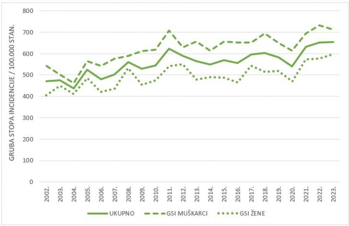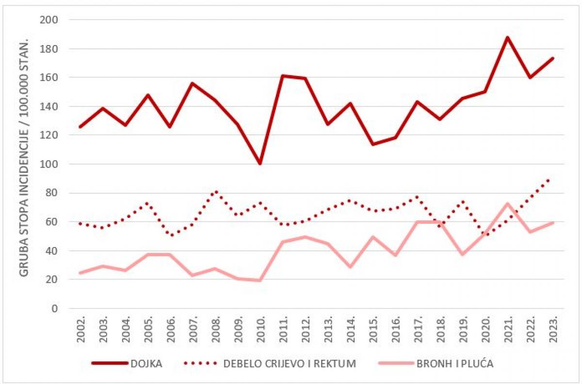 U 2023. godini u Hrvatskoj je zabilježeno 26.736 novih dijagnoza raka (bez nemelanomskog raka kože, C44); 14.239 u muškaraca (53 %) i 12.497 u žena (47 %) (2). Gruba stopa incidencije iznosila je 692,7/100.000 ukupno za oba spola odnosno 761,7/100.000 za muški spol i 627,9/100.000 za ženski.