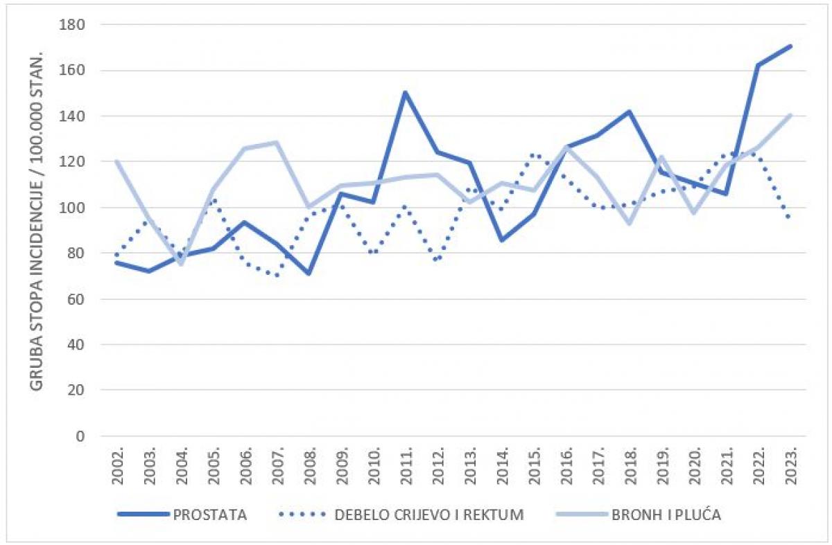 Slika 3. Grube stope incidencije za vodeća sijela raka za muški spol u Dubrovačko-neretvanskoj županiji 2002. - 2023.