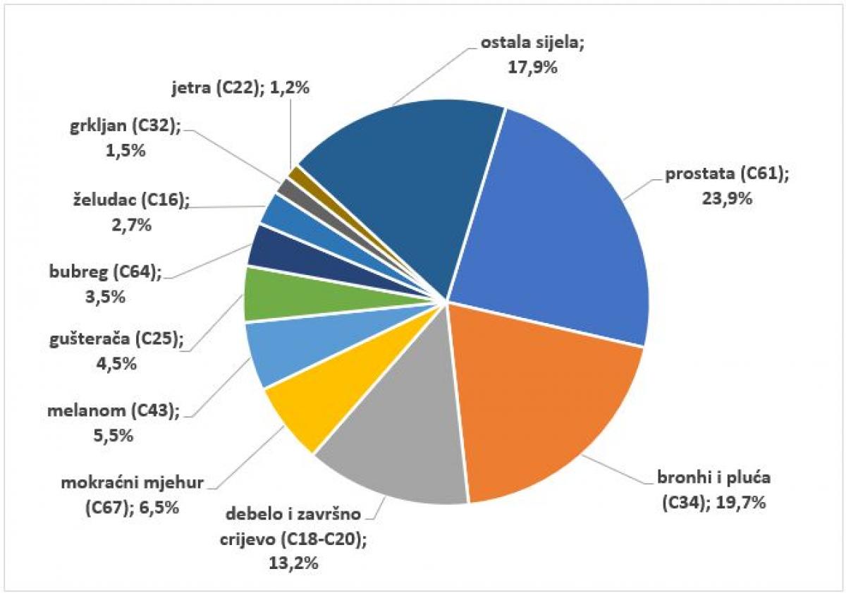 Najčešća sijela raka kod muškaraca u 2023. godini u Hrvatskoj bila su rak prostate (2927 slučajeva; 21 % svih dijagnoza raka u muškaraca), rak dušnika, bronha i pluća (2388; 17 %), rak debelog i završnog crijeva (2262; 16 %), rak mokraćnog mjehura i drugog urotelnog sustava (753; 5 %) i rak bubrega i bubrežne zdjelice (662; 5 %) (2).