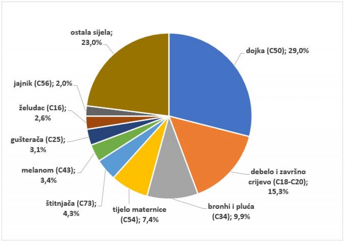 U 2023. godini najčešća sijela raka kod žena u Hrvatskoj bila su rak dojke (3293 novih slučajeva; 26 %), rak debelog i završnog crijeva (1558; 12 %), rak dušnika, bronha i pluća (1306; 10 %), rak tijela maternice (850; 7 %) i rak štitnjače (659; 5 %) (2).